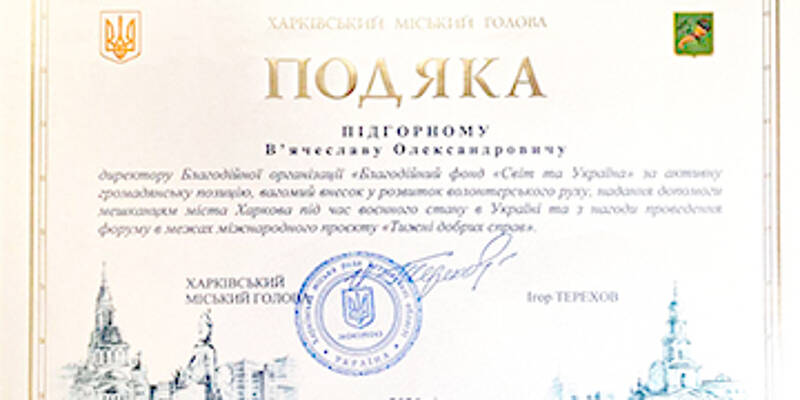 27.03.2025 р. нагороджений почесною грамотою від мера нашого міста І.Терехова наш здобувач другого (магістерського) рівня вищої освіти - В'ячеслав Підгорний, який очолює Благодійний фонд "Світ та Україна", за активну громадську позицію, вагомий внесок у розвиток волонтерського руху, надання допомоги мешканцям Харкова під час воєнного стану в Україні та з нагоди проведення форуму в межах міжнародного проекту "Тижні добрих справ".