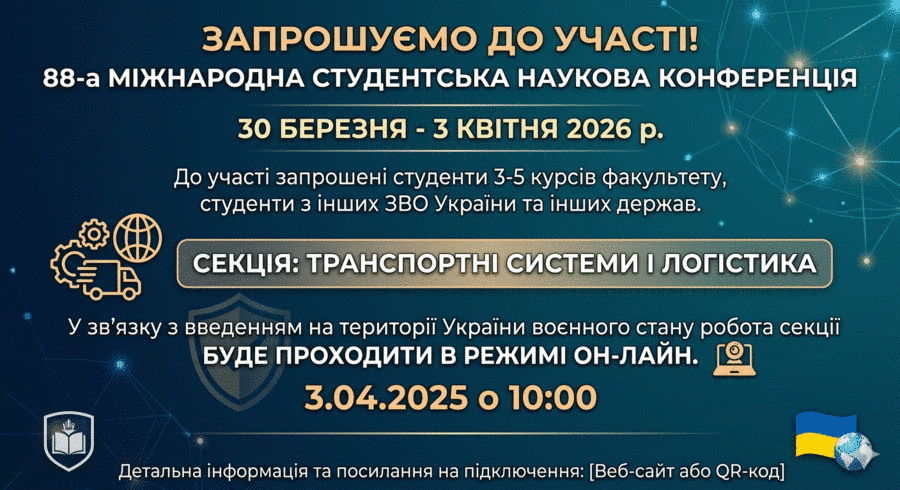 30 березня - 3 квітня 2026 р. відбудеться 88-а Міжнародна студентська наукова конференція, на яку запрошені студенти 3-5 курсів факультету, студенти з інших ЗВО України та інших держав. У зв’язку з введенням на території України воєнного стану робота секції Транспортні системи і логістика Конференції буде проходити в режимі он-лайн 3.04.2025 о 10:00.